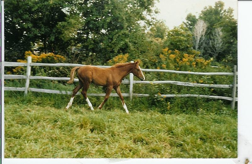 I also started riding our Warm blood cross mare that summer. She had a lot of names, so we'll just call her Annie. We just Galloped a lot. Nothing too serious, just a lot of fun. This is a picture of Annie when she was a foal. She's 21 this year and she's been a member of our family since 1984.